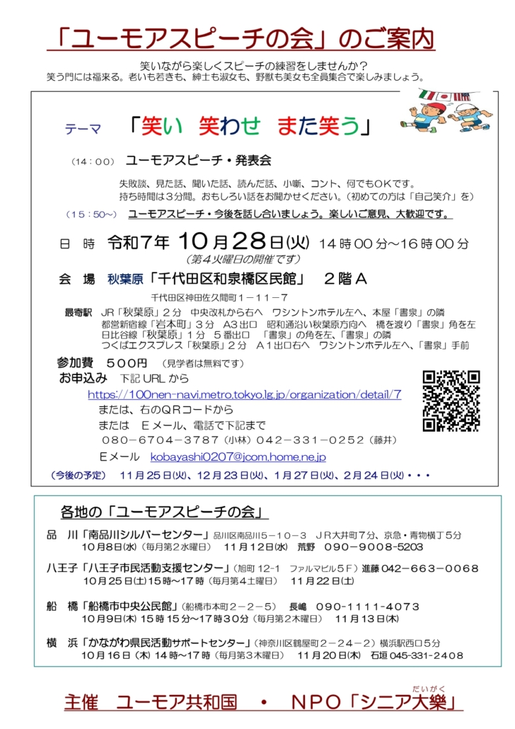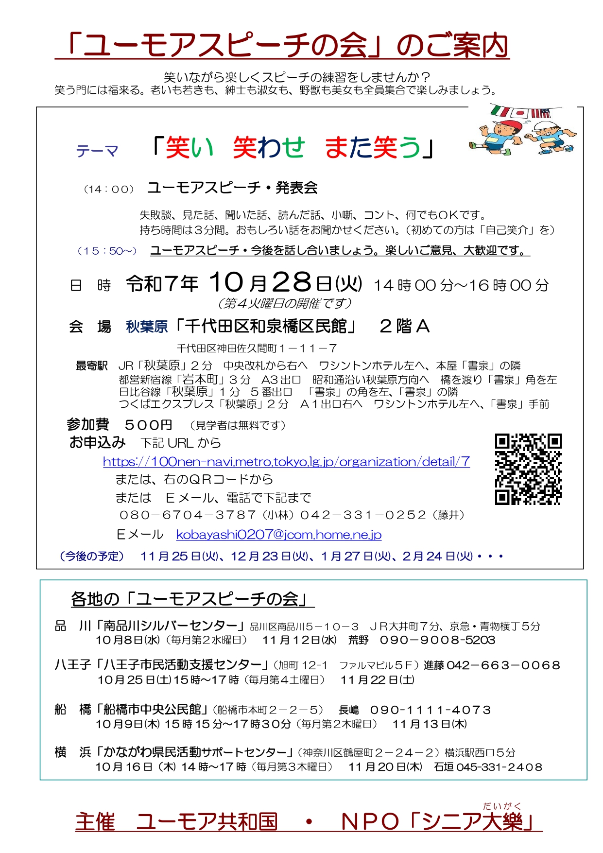 ○「ユーモアスピーチの会」:毎月第4火曜日、藤井先生(和泉橋区民館)