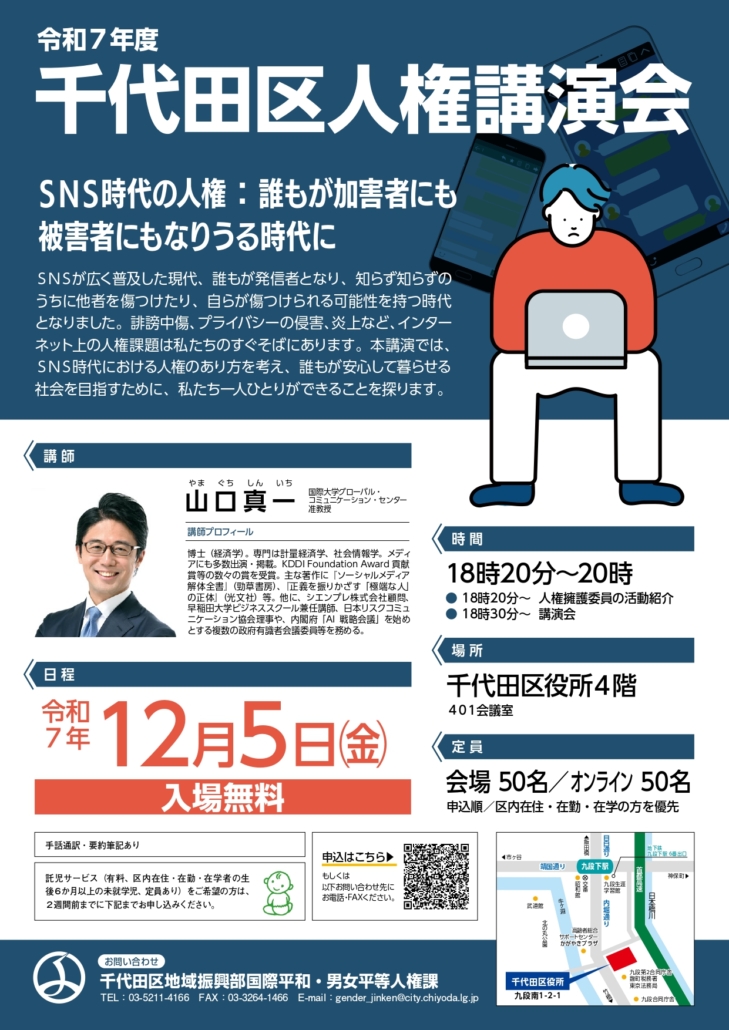 SNSが広く普及し誰もが発信者となり、知らず知らずのうちに他人を傷つけたり、自らが傷つけられる可能性を持つ時代となりました。誹謗中傷、プライバシーの侵害、炎上など、インターネット上の人権課題は私たちのすぐそばにあります。講演会では、SNSの人権のあり方を考え、誰もが安心して暮らせる社会を目指し、一人ひとりができることを探ります。