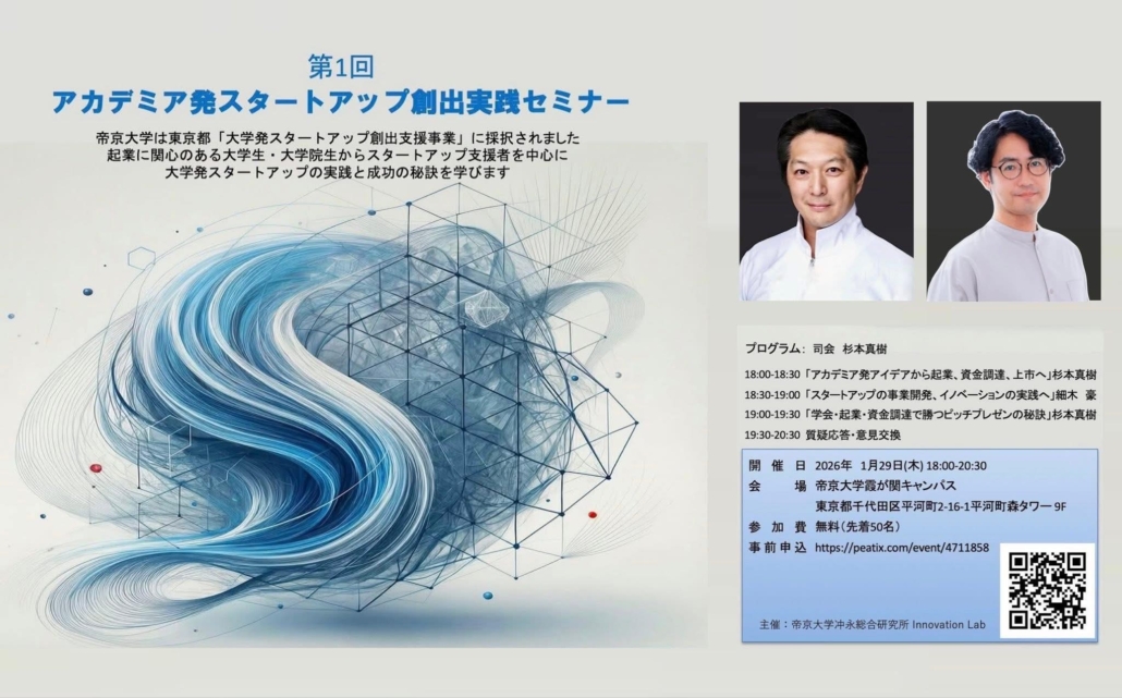 帝京大学は東京都「大学発スタートアップ創出支援事業」に採択されました。起業に関心のある大学生・大学院生からスタートアップ支援者を中心に、大学発スタートアップの実践と現状, 成功の秘訣を学びます。アカデミア発アイデアから起業、資金調達、上市への秘訣や、事業開発、イノベーション実践、さらに研究事業化・起業・資金調達を勝ち抜くピッチプレゼンテーションの秘訣などを当事者が実践的にお話しします。
