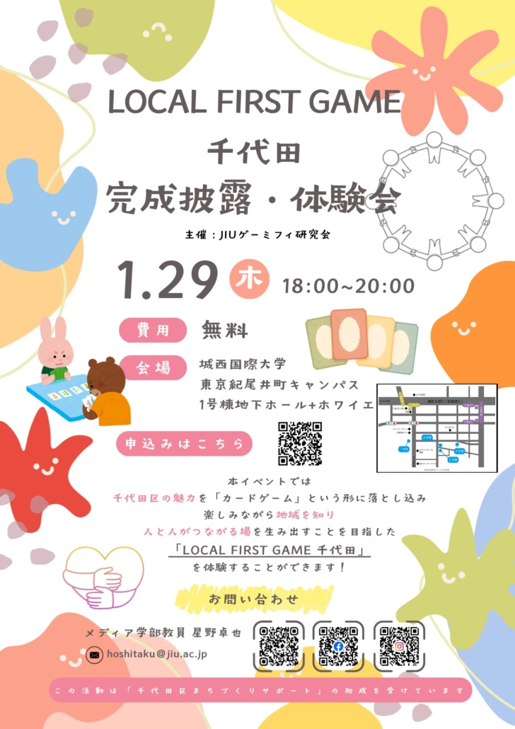 JIUゲーミフィ研究会は、千代田区に所在する「城西国際大学メディア学部」の星野卓也准教授のゼミ生を中心に、有志によって構成されています。「まちみらい千代田」の助成を受けて、第25回「千代田まちづくりサポート」の一環として、千代田区の魅力を「カードゲーム」という形に落とし込み、楽しみながら地域を知り、人と人がつながる場を生み出すことを目指した「LOCAL FIRST GAME 千代田」を制作しました。