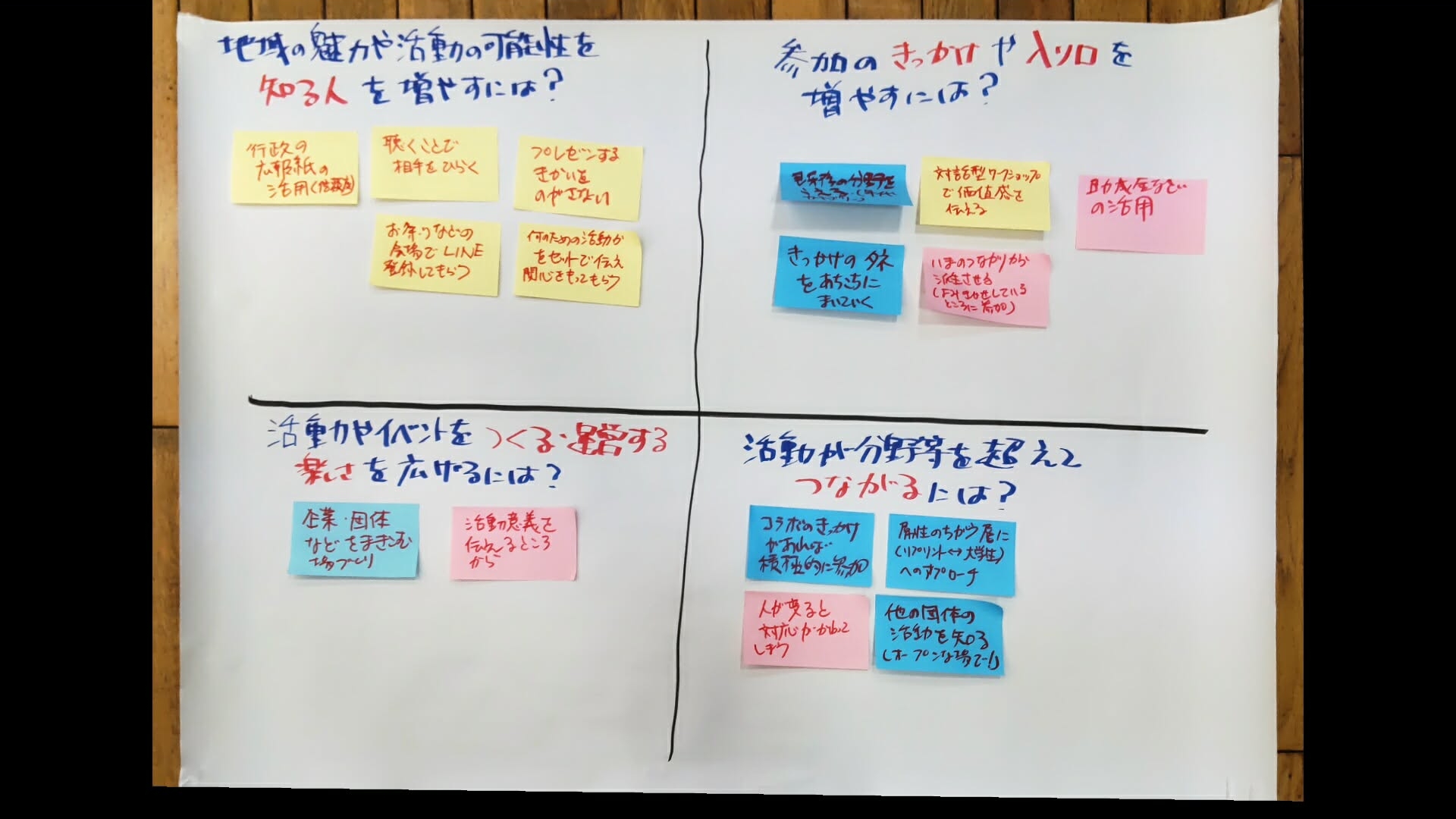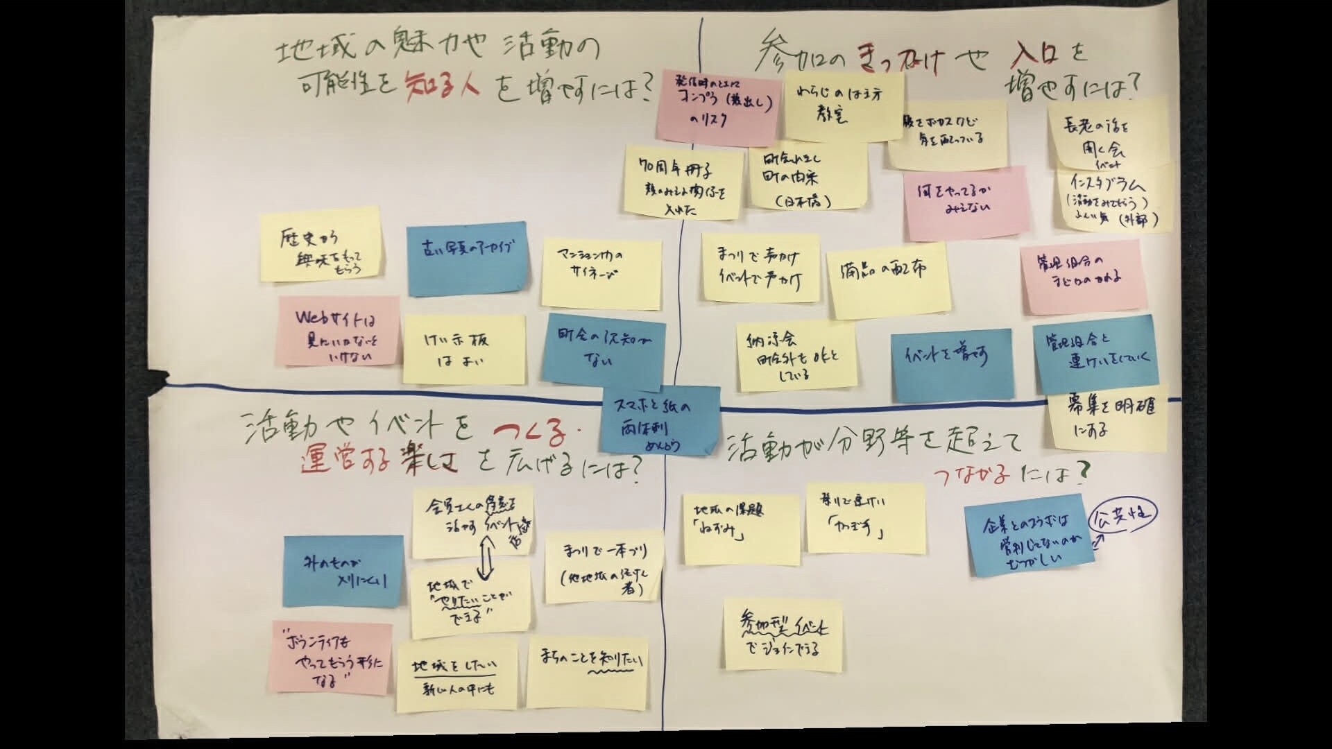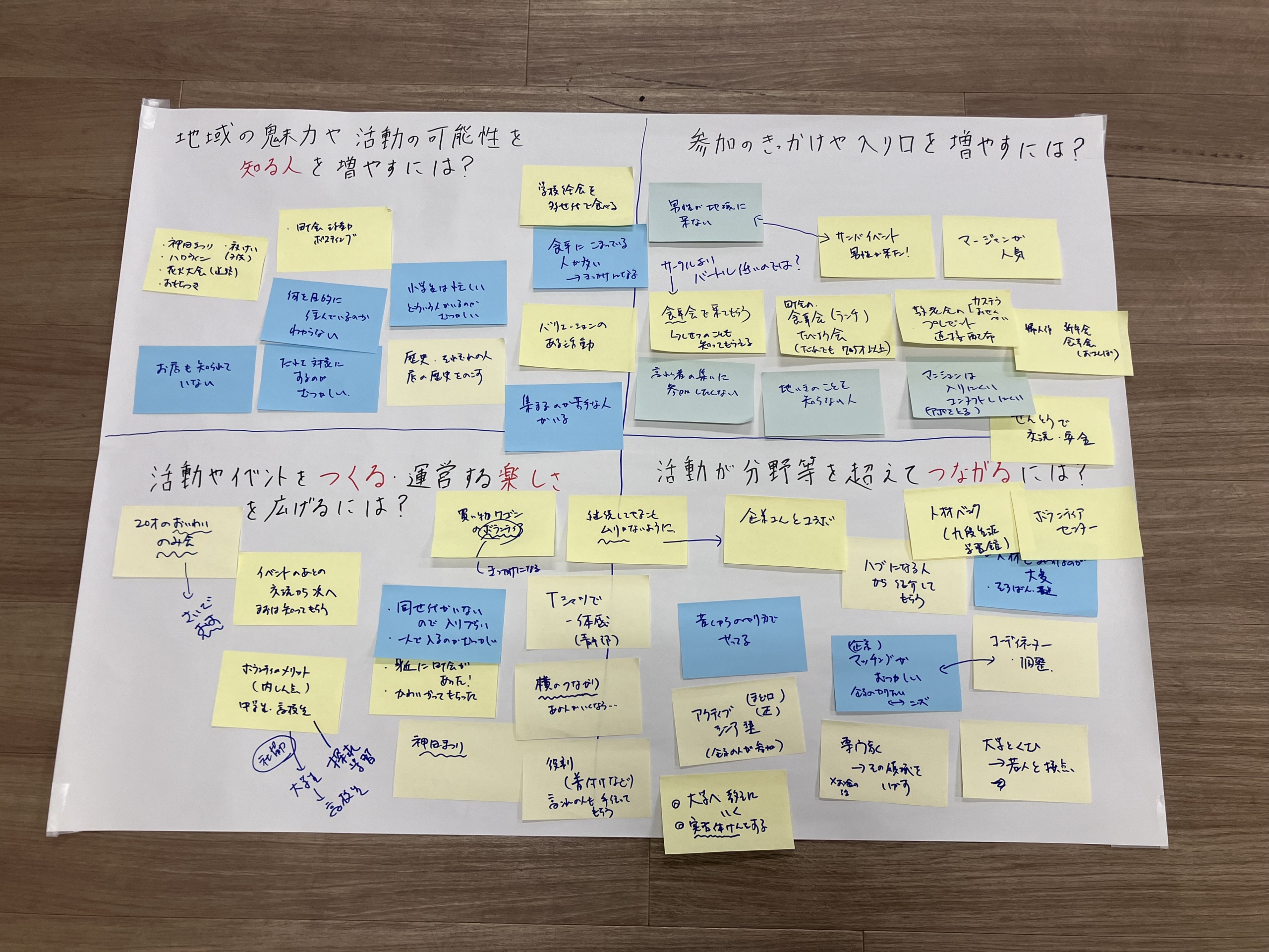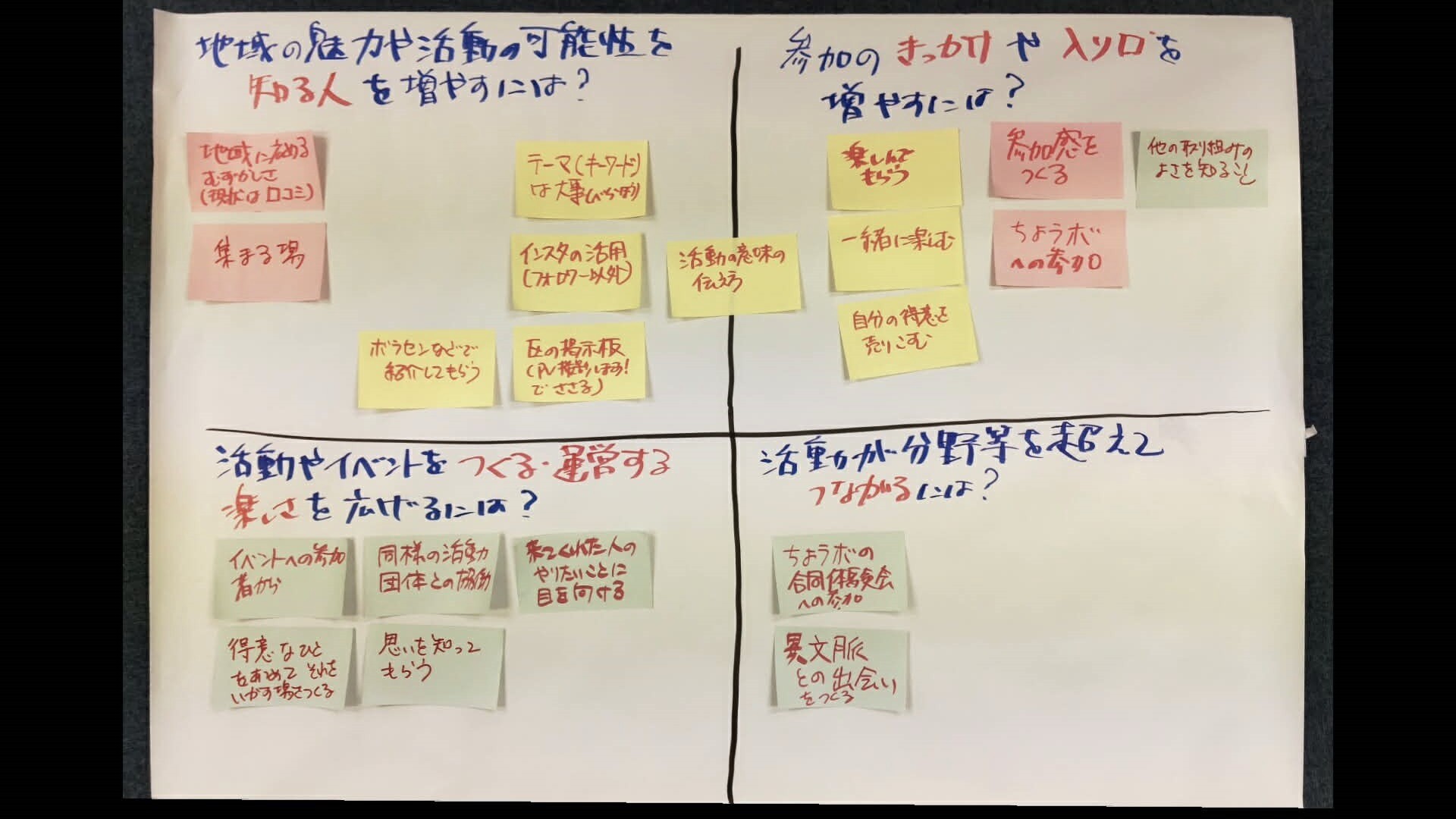 | 【コミュニティ醸成の4つのポイント】 1) 地域の魅力や活動の可能性を知る人を増やすには? 2) 参加のきっかけや入り口を増やすには? 3) 活動やイベントをつくる・運営する楽しさを広げるには? 4) 活動が分野等を超えてつながるには? |