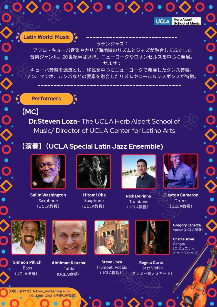 ■ 明治大学商学部および所康弘ゼミナールは、3月21日(土)、米国カリフォルニア大学ロサンゼルス校(UCLA)の音楽家グループを招き、「UCLA Latin World Music Concert―音楽でつながるラテン世界―」と題したコンサートを開催します。