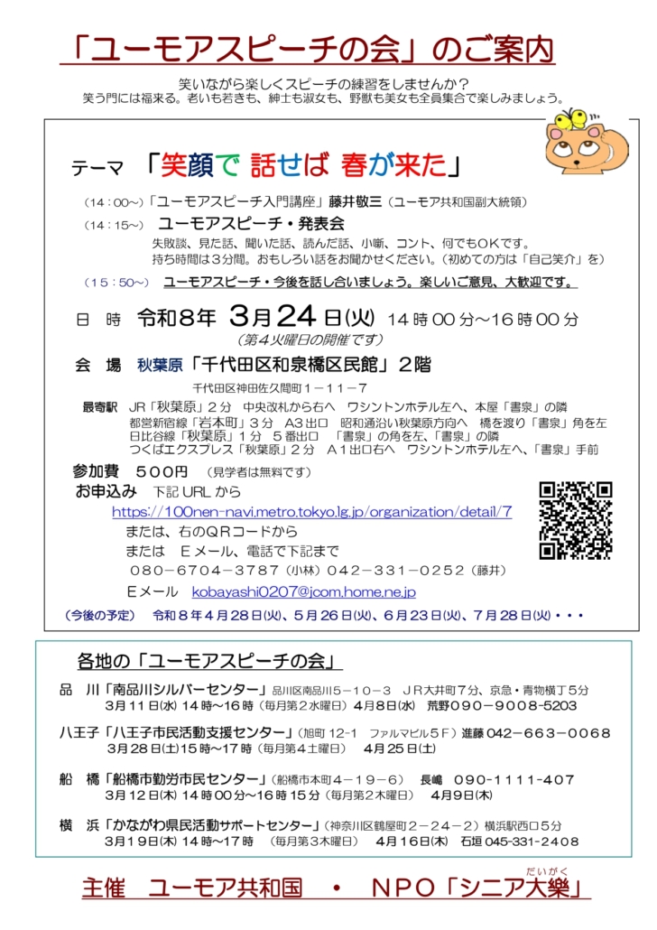 ○「ユーモアスピーチの会」:毎月第4火曜日、藤井先生(和泉橋区民館)